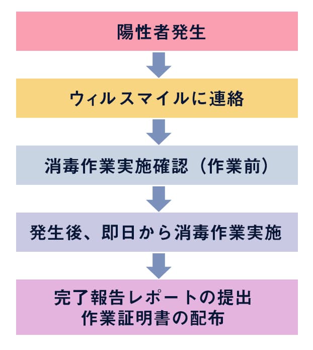 発生してからの消毒ではなく、事前に回避できる事が望ましいです。 ウィルスマイルでは発生後の消毒作業も勿論ですが、定期的な消毒・清掃を行っております。
