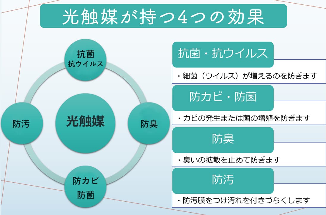 太陽や蛍光灯などの光が当たる、その表面で強力な酸化力を生み、接触する有機化合物や細菌などの有害物質を分解・除去するものです。